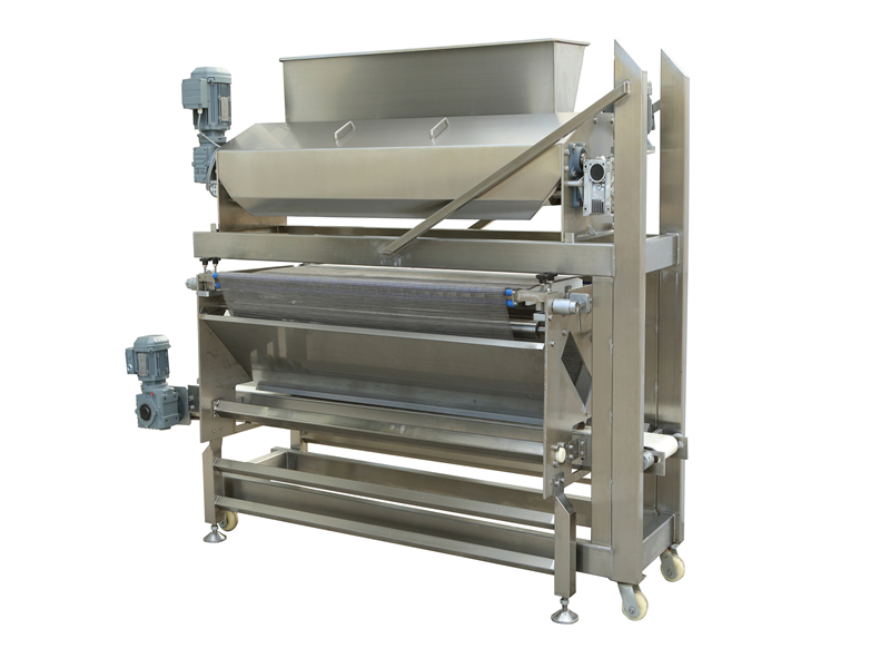 該設備應用于將固體顆粒或者粉狀調味料,鹽,糖,芝麻及果仁片等撒布在面皮或則餅干上。回收機回收多余的撒布物料循環利用。